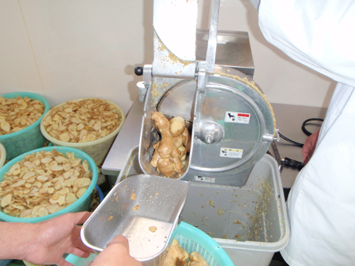 選別したしょうがをミキサーにかけるために、ほどよい5ミリ厚にスライスします。 あまり薄くしすぎるとカットした際にしょうがの持つ汁がこぼれてしまうことから、最適な5ミリ厚と決めています。