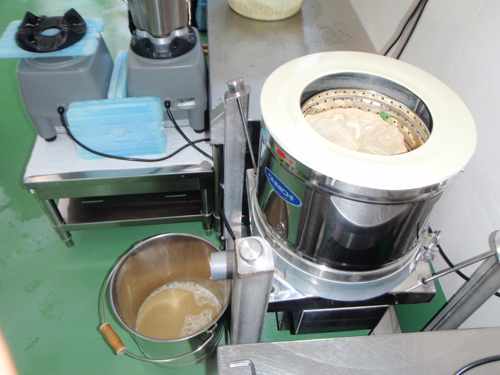 木綿豆腐づくりに使用する布よりもやや木目の細かい布を使用して、しょうがの繊維と汁を分離します。