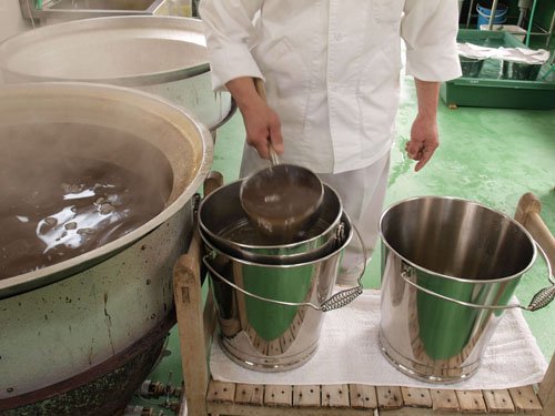 2時間半ほどかけてじっくり炊き込んだしょうが汁がたっぷりと入った釜から取り出します。さらさらでなく、とろっとした蜜のように仕上がっています。その後、釜上げしたあわせしょうがを専用の冷却槽に入れて冷まします。
